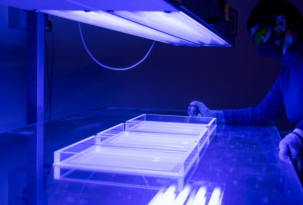 La tecnica di formatura sviluppata negli anni, diversa dalla termoformatura tradizionale, consente di ottenere forme complesse da lastre piane mantenendo elevata qualità ottica ed estetica. Il processo garantisce spessori costanti su tutto il componente e il rispetto delle principali normative.